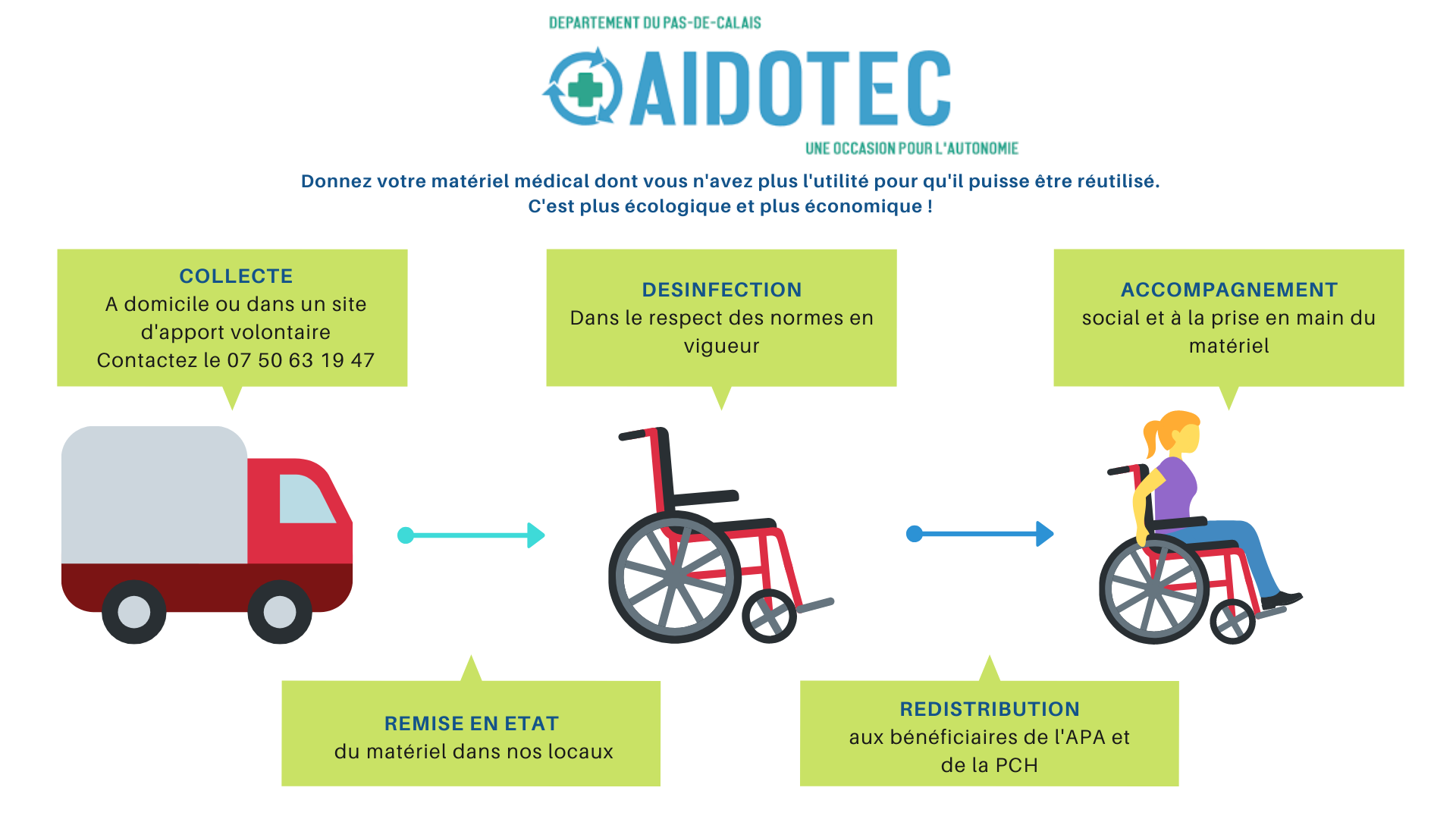 Le but ? Récupérer du matériel médical d'occasion à destination des personnes agées et en situation de handicap. Les bénéficiaires de l'APA (Allocation Personnalisé d'Autonomie) et de la PCH (Prestation de Compensation du Handicap) pourront donc en profiter. Les matériaux seront ensuite remis en état, désinfectés et distribués aux bénéficiaires.