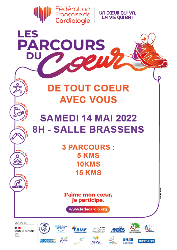 Après plusieurs années d’absence, les parcours du cœur reviennent sur la commune ! Les enfants pourront en profiter lors des parcours du cœur scolaires le vendredi 13 mai. Le samedi 14 mai, vous pourrez chausser vos plus belles baskets et votre plus beau jogging pour participer au Parcours du cœur en courant ou en marchant ! Ouvert à tous, un service de navette est prévu pour ceux qui en auraient besoin pour le retour. Trois parcours sont prévus avec des départs de 8h à 9h : • 5 kms • 10 Kms • 15 kms (Aller-Retour)